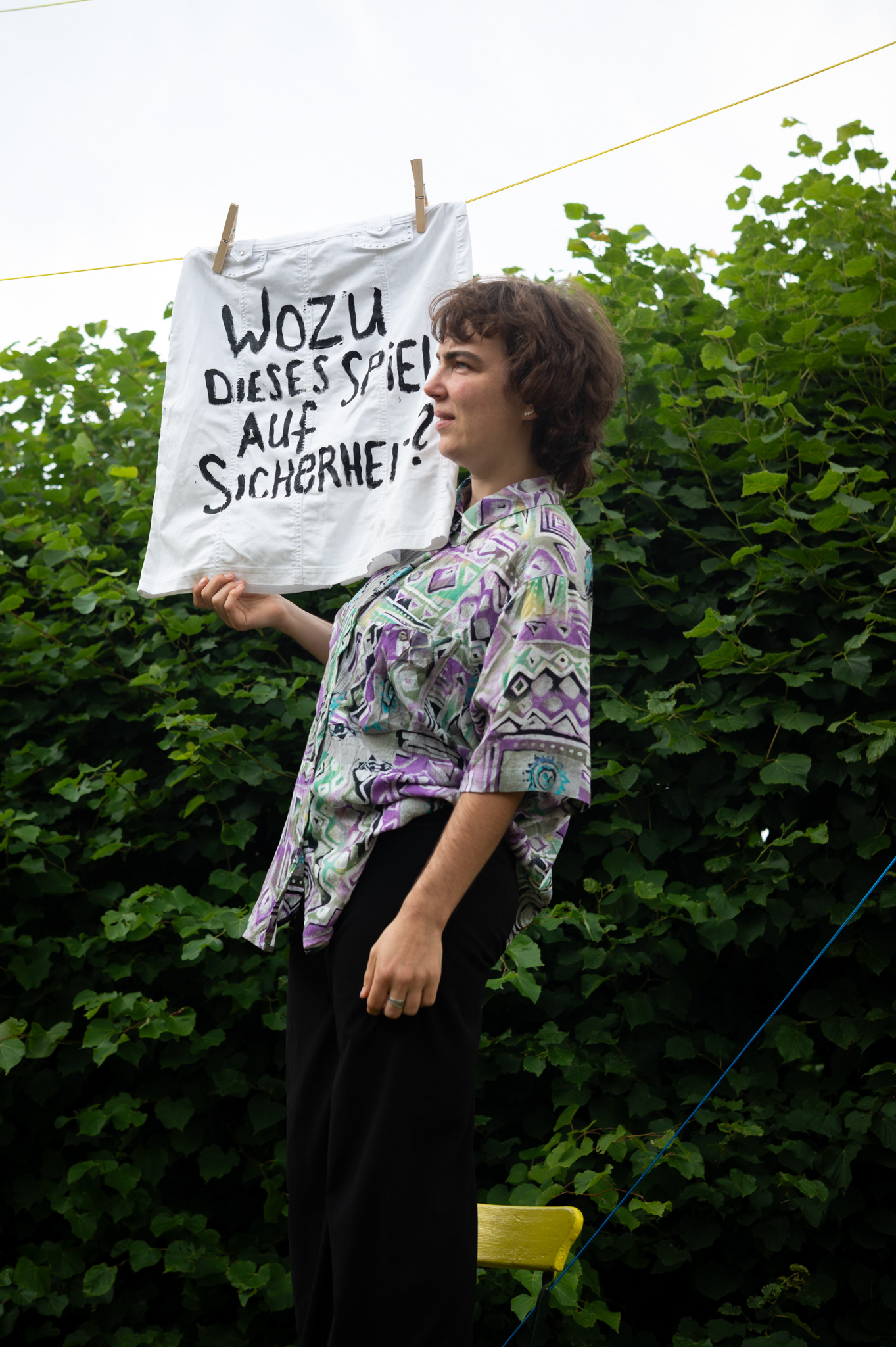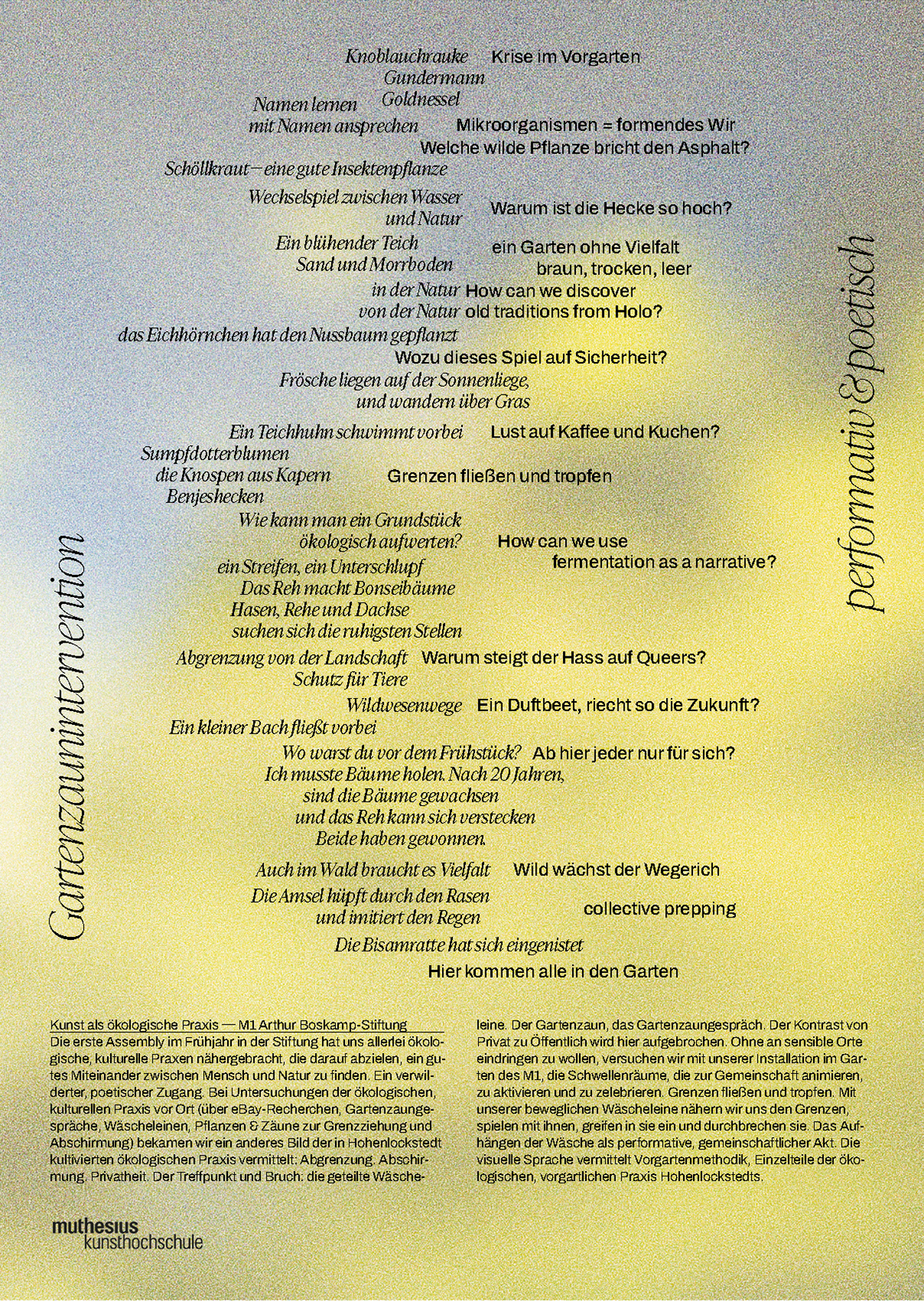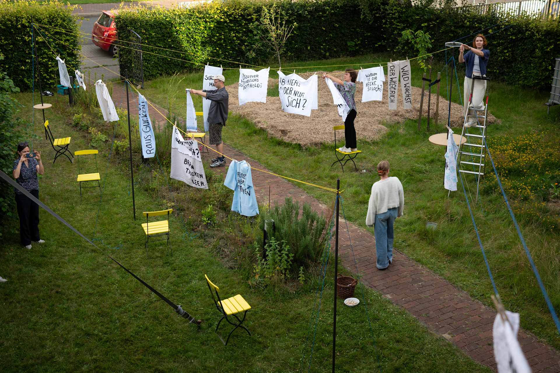 Die erste Assembly im Frühjahr in der Stiftung hat uns allerlei ökologische, kulturelle Praxen nähergebracht, die darauf abzielen, ein gutes Miteinander zwischen Mensch und Natur zu finden. Ein verwilderter, poetischer Zugang. Bei Untersuchungen der ökologischen, kulturellen Praxis vor Ort (über eBay-Recherchen, Gartenzaungespräche, Wäscheleinen, Pflanzen & Zäune zur Grenzziehung und Abschirmung) bekamen wir ein anderes Bild der in Hohenlockstedt kultivierten ökologischen Praxis vermittelt: Abgrenzung. Abschirmung. Privatheit. Der Treffpunkt und Bruch: die geteilte Wäscheleine. Der Gartenzaun, das Gartenzaungespräch. Der Kontrast von Privat zu Öffentlich wird hier aufgebrochen. Ohne an sensible Orte eindringen zu wollen, versuchen wir mit unserer Installation im Garten des M1, die Schwellenräume, die zur Gemeinschaft animieren, zu aktivieren und zu zelebrieren. Grenzen fließen und tropfen. Mit unserer beweglichen Wäscheleine nähern wir uns den Grenzen, spielen mit ihnen, greifen in sie ein und durchbrechen sie. Das Aufhängen der Wäsche als performative, gemeinschaftlicher Akt. Die visuelle Sprache vermittelt Vorgartenmethodik, Einzelteile der ökologischen, vorgartlichen Praxis Hohenlockstedts.