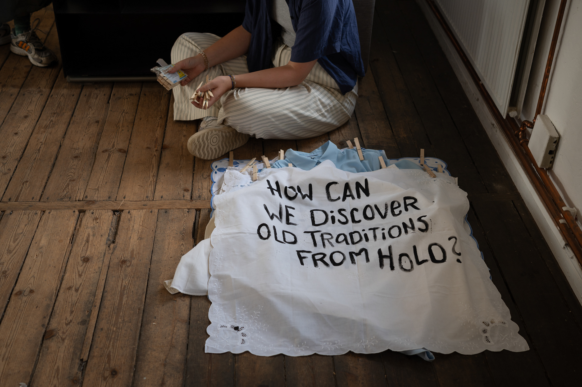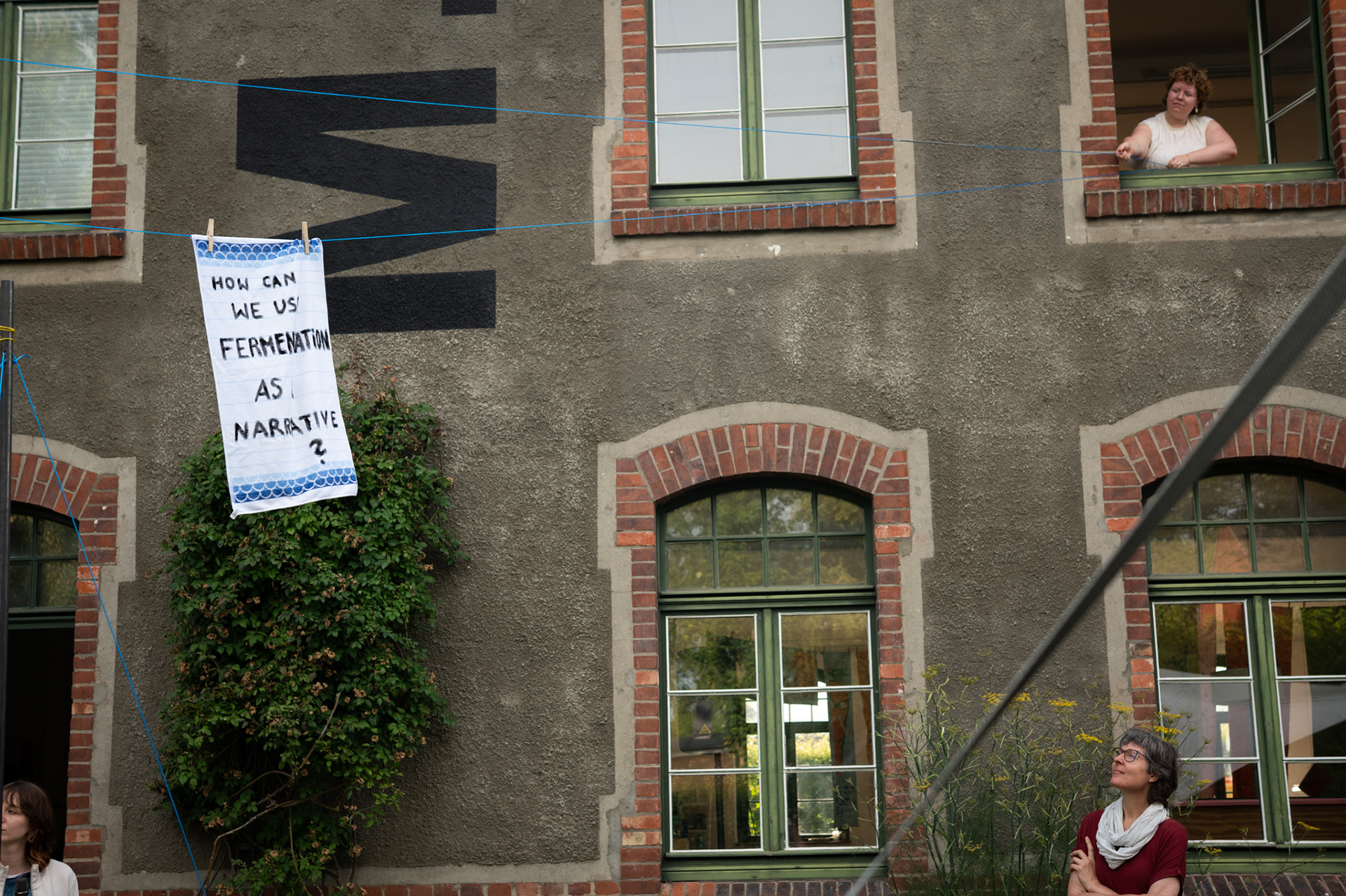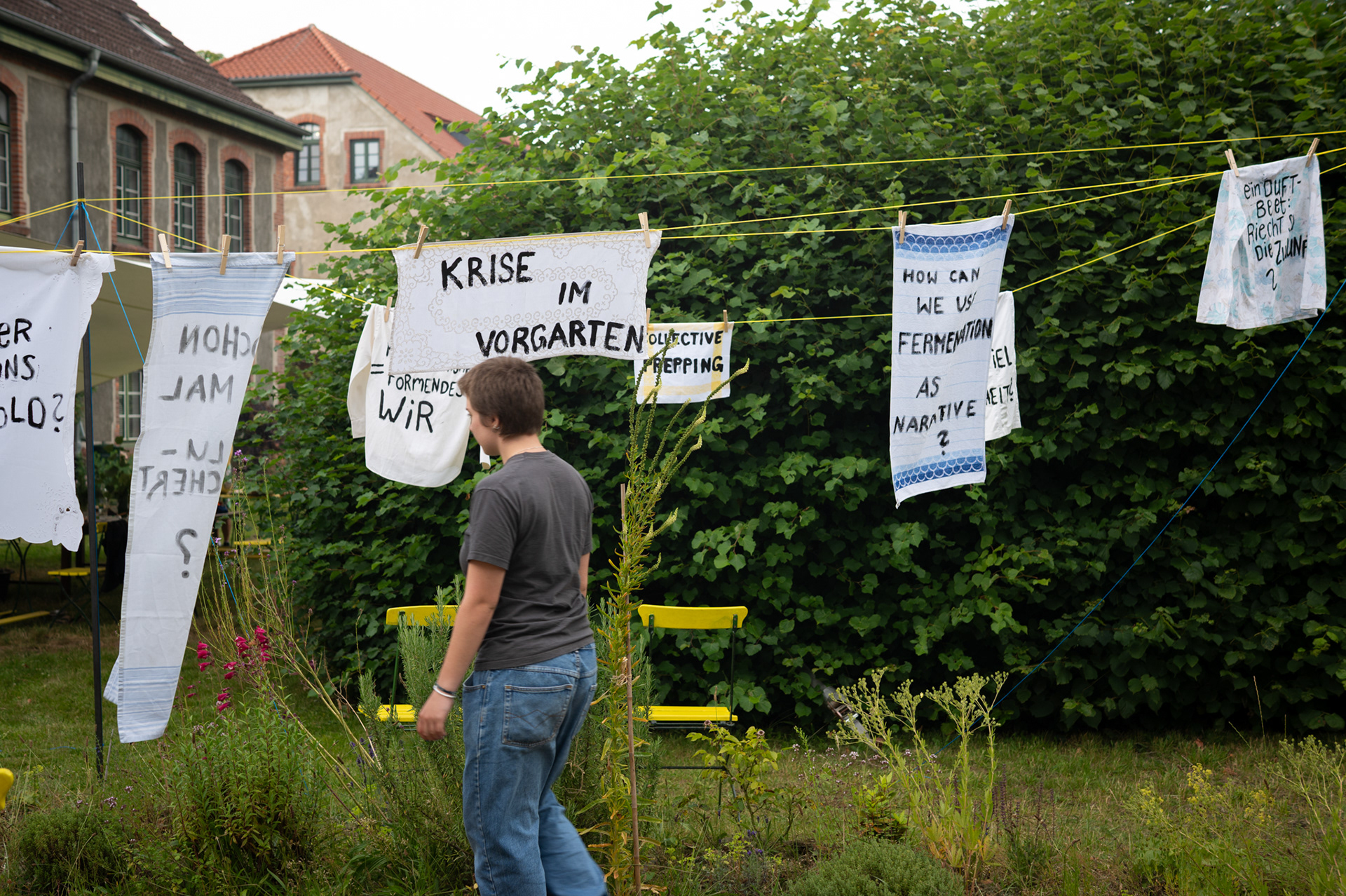 Die erste Assembly im Frühjahr in der Stiftung hat uns allerlei ökologische, kulturelle Praxen nähergebracht, die darauf abzielen, ein gutes Miteinander zwischen Mensch und Natur zu finden. Ein verwilderter, poetischer Zugang. Bei Untersuchungen der ökologischen, kulturellen Praxis vor Ort (über eBay-Recherchen, Gartenzaungespräche, Wäscheleinen, Pflanzen & Zäune zur Grenzziehung und Abschirmung) bekamen wir ein anderes Bild der in Hohenlockstedt kultivierten ökologischen Praxis vermittelt: Abgrenzung. Abschirmung. Privatheit. Der Treffpunkt und Bruch: die geteilte Wäscheleine. Der Gartenzaun, das Gartenzaungespräch. Der Kontrast von Privat zu Öffentlich wird hier aufgebrochen. Ohne an sensible Orte eindringen zu wollen, versuchen wir mit unserer Installation im Garten des M1, die Schwellenräume, die zur Gemeinschaft animieren, zu aktivieren und zu zelebrieren. Grenzen fließen und tropfen. Mit unserer beweglichen Wäscheleine nähern wir uns den Grenzen, spielen mit ihnen, greifen in sie ein und durchbrechen sie. Das Aufhängen der Wäsche als performative, gemeinschaftlicher Akt. Die visuelle Sprache vermittelt Vorgartenmethodik, Einzelteile der ökologischen, vorgartlichen Praxis Hohenlockstedts.