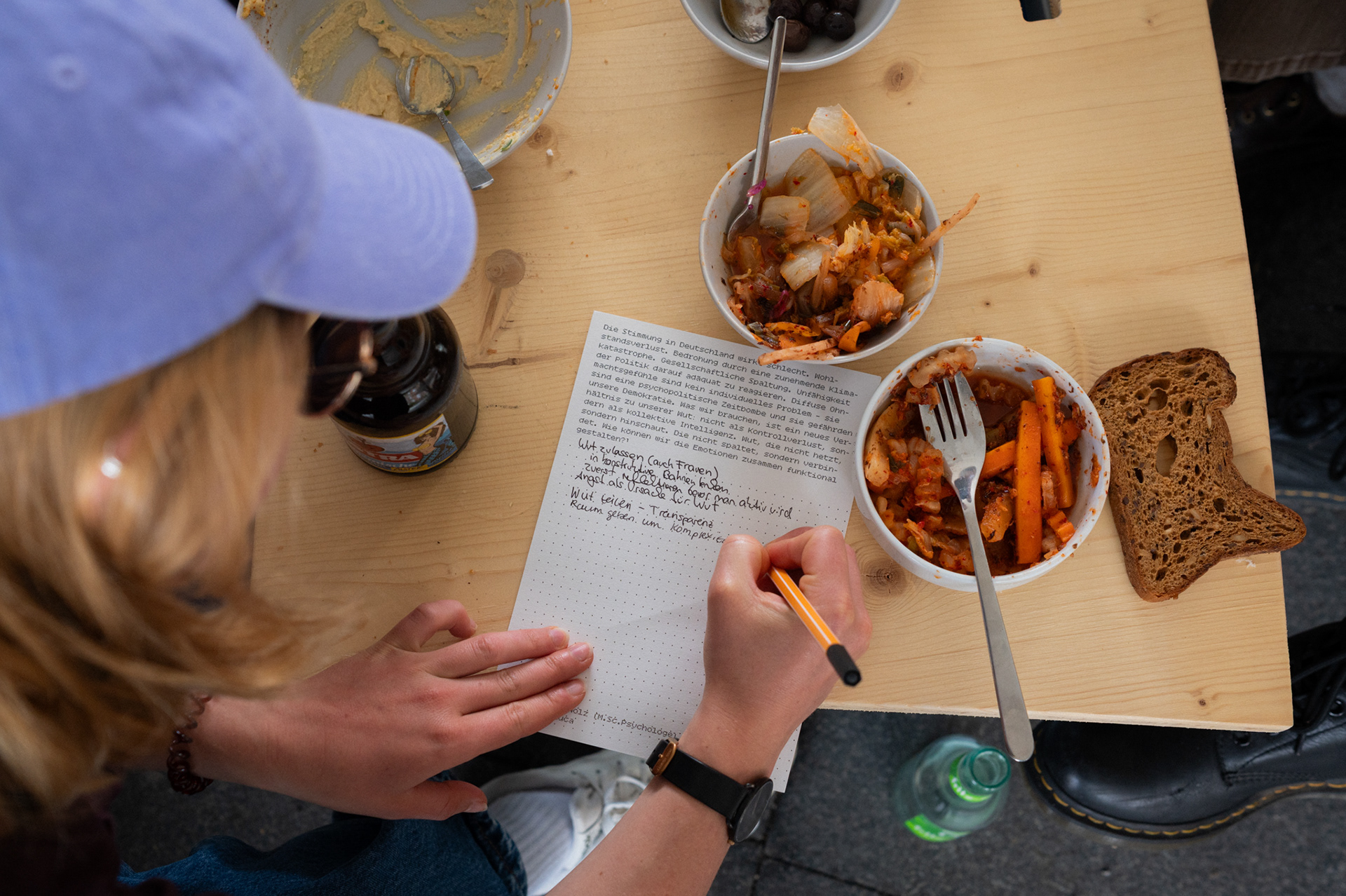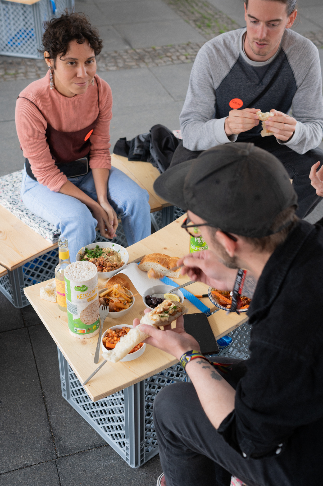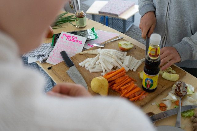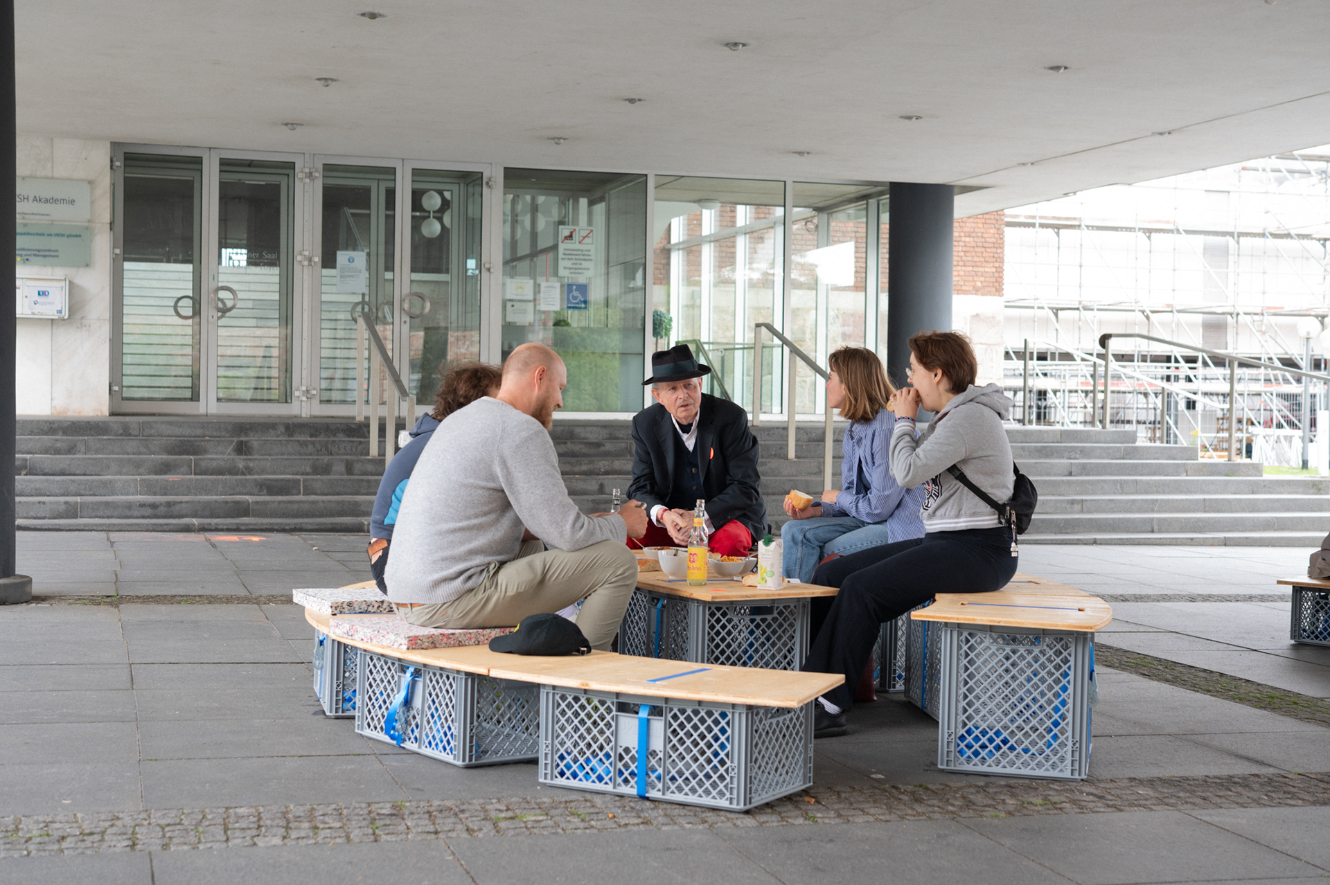 Innerhalb des Programms von NUKLEUS Kiel haben zuerst zwei aufeinander aufbauende Um:Tisch-Formate auf dem Kieler Schloss(hof) stattgefunden. Anfang Juli haben wir zusammen in einem Kimchi-Workshop Kohl und Gedanken fermentiert, welche eine Grundlage für das Social-Dinner-Format dargestellt haben. Dort sind wir mit Menschen ins Gespräch gekommen und haben die erarbeiteten Fragen aus dem Workshop besprochen. Bei der Agora der Demokratie haben wir gemeinsam gekocht und anschließend an einer langen Tafel gegessen. An dieser Stelle möchte ich allen danken, die zur Realisierung des Projekts beigetragen haben: Dem gesamten NUKLEUS-Team für die organisatorische Unterstützung und Sven Christian Schuch für seine kuratorische Begleitung. Dank der Förderung durch die Unterstützer*innen von NUKLEUS Kiel konnten die Formate in dieser Form umgesetzt werden. Das Möbelkonzept ist in Zusammenarbeit mit Katrin Fuchs und Anna Wilkens entstanden.